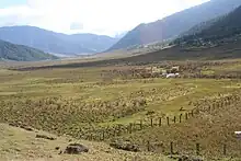 The conservation area or habitat in the Phobhjikha Valley, established in 2003 has, not only the black-necked cranes, but also 13 other vulnerable species such as rufous-necked hornbill Aceros nipalensis, chestnut-breasted partridge Arborophila mandellii, Pallas's fish eagle Haliaeetus leucoryphus, nuthatch Sitta Formosa, wood snipe Gallinago nemoricola, Blyth's tragopan Tragopan blythii, greater spotted eagle Clanga clanga, imperial eagle Aquila heliaca, Baer's pochard Aythya baeri, Hodgson's bushchat Saxicola insignis, dark-rumped swift Apus acuticauda, and grey-crowned prinia Prinia cinereocapilla.[1] The black-necked cranes arrive in this valley in late October and depart in mid February.[8] They feed on the particular type of dwarf bamboos that grow in the wetlands of the valley. The thick grasslands of wetlands are also grazing grounds for a large number of cattle and horses during the summer months that helps the growth of the tender bamboo shoots on which the cranes feed later during the winter season. There were suggestions that the wetlands be drained and used to grow cash crops such as potatoes, which is also the main crop of the valley. Such an action would have deprived the cranes of their main feeding centres.[9] However, Palje "Benjie" Dorji, former Chief Justice of Bhutan, former Minister for Environment and uncle of the present King of Bhutan, as the Chairman of the Royal Bhutan Society and as founder of the Black-necked Conservation Programme prevailed on the Government of Bhutan to drop the proposal to drain the wetlands of the Phobjika Valley to create farms to grow cash rich seed potatoes.[3][10]