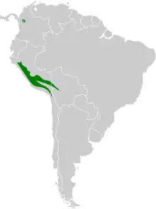 It is found in the northern Andes (mainly in Peru but also in Colombia, western Bolivia and far northern Chile). Its natural habitats are subtropical or tropical moist montane forests, subtropical or tropical high-altitude shrubland, and heavily degraded former forest.