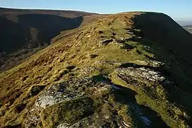 There is a very small parking (room for about 6 cars) and picnic area at the southern tip of the ridge, at the far end of minor roads leading from Longtown, Herefordshire. It is signposted at a road junction north of Longtown, and is shown on most Ordnance Survey maps of the area. The parking area lies to the north of the Little Back Hill. The access roads are however, narrow and all single track, although there are numerous passing places. The walk from the car park along the ridge to the trig point which marks the top of the hill is clear and easily followed in good weather, with two large cairns beyond the rocky outcrops along the Cat's Back. There is a small pool in the peat near the summit, its size depending on local rainfall. The path can be continued on a well marked and visible track to Hay Bluff, a prominent peak above Hay-on-Wye and the Gospel Pass. The path crosses several peat bogs and there is a small pool near the summit itself. Return can be made along the ridge or by a diversion along the Offa's Dyke Path along the Hatterall Ridge, and then by descent into the valley of the river Olchon. There is a direct route from the ridge which follows the river Olchon via an old bridleway, and leads on to the minor road which circles the valley. It is marked by a small cairn by the main path, and the path crosses at one point a rocky landslip by the side of the stream. The ridge is common land and thus open to all both on and off the several paths on the hill. It is grazed by sheep, ponies and cattle.[1]