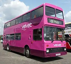 On 16 July 2014, the company announced it had ceased trading, with other operators stepping in to cover its services.[8][9][10] However two days later operations resumed, with the company announcing on Twitter that it had new owners.[11] Founder and former managing director Phil Stockley commented that the company had not entered any formal insolvency process, and that he would no longer be involved in running Velvet.[12] After operating the service for two weeks on an interim basis, Adam Smith purchased the business.[13][14][15] Smith was convicted of possessing counterfeit money a month later, but avoided a prison sentence as jobs at Velvet depended upon him.[16] Velvet's director Michael Bishop took over Cornish independent Western Greyhound in December 2014, with Smith becoming its managing director.[17] On 10 January 2015, Velvet ceased operating, with the three remaining routes passing to Xelabus.[18][19][20]