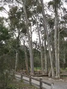 Eucalypts and a gravel pathway in Blackburn Lake Sanctuary near the old flower farm