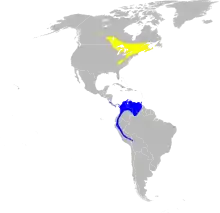 The breeding habitats of these birds are mature coniferous woodlands, the central part of their breeding range being in the southeastern portion of Canada's boreal forest. However, their distribution as a breeding species continues broadly down much of New England and the Appalachian Mountains, from New York to northernmost Georgia, in elevated mixed woodlands, especially ones containing spruce and hemlocks.[17] Hemlocks in particular are most likely to host Blackburnian warblers in mixed forests.[18] It typically winters in tropical montane forests, from roughly 600 to 2,500 m (2,000 to 8,200 ft), mainly from Colombia to Peru, more sporadically in Panama and the Amazon region.[19][20][21]