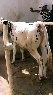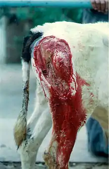 Blackleg, black quarter, quarter evil, or quarter ill (Latin: gangraena emphysematosa) is an infectious bacterial disease most commonly caused by Clostridium chauvoei, a Gram-positive bacterial species. It is seen in livestock all over the world, usually affecting cattle, sheep, and goats. It has been seen occasionally in farmed bison and deer.[1] The acute nature of the disease makes successful treatment difficult, and the efficacy of the commonly used vaccine is disputed.[2]