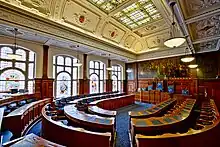 The building was commissioned to replace an 18th-century town hall located just to the south of the current structure close to the old St John's Market.[2] The new building, which was designed by Potts, Son and Hennings in the Jacobean style, was built on Talbot Square and completed in 1900.[1] The design involved a symmetrical main frontage with seven bays facing onto the Talbot Square with the outer bays curving round to the sides; the central bay featured a five-stage square clock tower with the ground floor forming a portico with Tuscan order pilasters and first floor forming a portico with Ionic order columns with a segmental pediment and a balustrade above.[1] The ship's bell from HMS Foudroyant, which was wrecked on Blackpool Sands in 1897, was recovered and placed in the town hall, when it opened.[3] The murals in the council chamber, which were painted by J. R. Brown in 1901, portray, firstly, the marriage of King Henry VII (of Lancaster) to Princess Elizabeth (of York) in 1486,[4] secondly, the surrender of the Jacobite rebels at Battle of Preston in 1715,[5] and thirdly, the last charge of King Richard III at Bosworth Field in 1485.[6][7]