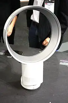 A bladeless fan, also known as an Air multiplier fan, is a fan that blows air from a ring or oval opening with no external blades.[1] Despite the name, these fans do have blades, mounted on a propeller hidden in the base.