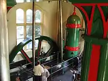 When the lake first opened there were four Woolf compound rotative beam pumping engines, housed in two separate buildings. They were built by Glenfield & Kennedy of Kilmarnock between 1900 and 1905. The engine's beam is 34 ft (10.36 m) long and weighs 17 tons. The flywheel is 20 ft (6.10 m) in diameter and weighs 20 tons,[4] having a crank throw of 3.5 ft (1.07 m). Each beam engine had an output of 170 horsepower (130 kW) at 17 rpm. The high-pressure cylinders, 21 inches (53.3 cm) in diameter and with a 3.25 ft (0.99 m) stroke, were supplied by steam from horizontal Lancashire-type twin flue boilers with Green's economisers at 100 pounds per square inch (6.9 bar). The low-pressure cylinder was 34 inches (86.4 cm) in diameter and has a 7 ft (2.13 m) stroke. Three engines with a fourth on standby could pump water at a rate of 7.5 million imperial gallons (34,000 m3) per day, whilst the boilers consumed 8.5 tons of coal per day. A mechanical efficiency of 90% was claimed, the 30-inch (76.2 cm) diameter pump bucket, 3.5 ft (1.07 m) strike and plunger diameter of 21 inches (53.3 cm) gave a pump output of 107 imperial gallons (490 L) per stroke. They ran until 1949, when two engines from the north engine house were replaced by electric pumps.[12] In 1950 automatic shutdown equipment was installed to prevent damage in the event of a burst main or overloading of the new electric pumps. This meant that it was no longer essential to have staff on site 24 hours a day.[13] The decorative chimney was shortened in the 1960s.[2] In 2014 new split-case vertical pumps and various other new equipment was installed to replace those installed in the 1940s and 1950s.[14]