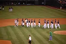 By September, the Dodgers were eliminated by the Rockies from playoff contention, and the Diamondbacks were expected to clinch the National League West division title. The Padres held a steady lead on the National League wild card spot. The Diamondbacks eventually clinched the NL West division title, but the Rockies shot up with one of the greatest comebacks in baseball history. They were a major-league best 20–8 in September, after trailing 6 games on September 1.[6][7] They won their last 14 of 15 games, including 11 in a row, the most of any team in the 2007 season and an all-time franchise record.[8][9][10] The only loss during that streak was on September 28 to the Arizona Diamondbacks, a loss that clinched the Diamondbacks' playoff spot. Their 90–73 regular season mark set a franchise record. They also finished ahead of the Dodgers in the division for the first time in franchise history.[11] Furthermore, Colorado set the single-season MLB record for fielding percentage by one team (.98925).[12] Despite the Rockies record-setting performance, the National League coaches and players did not vote in any of Colorado's players for the NL Gold Glove award. The two most puzzling omissions were first baseman Todd Helton and shortstop Troy Tulowitzki. Both players had a better fielding percentage, more total chances, better zone rating, more putouts, more double plays turned, better range factor and more assists than their counterparts who won the award instead (Chicago Cubs first baseman Derrek Lee and Philadelphia Phillies shortstop Jimmy Rollins). Helton also had fewer errors (2) than Lee (7), while Tulowitzki had as many errors as Rollins (11), but did so on 834 total chances compared to Rollins' 717.[13]