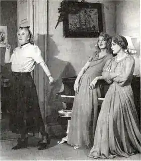 Ruth's ghost immediately comes back for revenge on Elvira, and though Charles cannot at first see Ruth, he can see that Elvira is being chased and tormented, and his house is in uproar. He calls Madame Arcati back to exorcise both the spirits, but instead of banishing them she unintentionally materialises Ruth. With both his dead wives now fully visible, and neither of them in the best of tempers, Charles, together with Madame Arcati, goes through séance after séance and spell after spell to try to exorcise them. It is not until Madame Arcati works out that the housemaid, Edith, is psychic and had unwittingly been the conduit through which Elvira was summoned that she succeeds in dematerialising both ghosts.[10] Charles is left seemingly in peace, but Madame Arcati, hinting that the ghosts may still be around unseen, warns him that he should go far away as soon as possible. Coward repeats one of his signature theatrical devices at the end of the play, where the central character tiptoes out as the curtain falls – a device that he also used in Present Laughter, Private Lives and Hay Fever.[11] Charles bids his vanished wives farewell and leaves at once; the unseen ghosts throw things and wreck the room as soon as he has gone.[12]