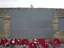 The cemetery is surrounded by a 3 feet (1 metre) high wall with a small entrance open to the beach in the style of a stone sheep corral. Opposite the entrance, the wall is tapered higher with seven slate panels, six with the Regiment, Name, Rank and Service of the fallen and one with the three Forces' Emblems and the following inscription;
