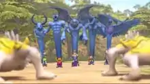 The party arrives at a giant Mechat base in the clouds and are tossed into the throne room of Nene, the apparent leader. Nene explains to them how he enjoys hearing the screams of the dying victims of the Land Shark. The party battles Nene, but are easily defeated.[13] They are thrown out of the base and start to fall to their deaths, but a beam of light from the base catches them, and brings them back to the base. The party find three small floating spheres in the middle of the room; a mysterious voice commands them to swallow the spheres. The party refuses, and instead hold onto the spheres for safekeeping. As they try to reach another Mechat to escape the base, they are forced to fight a large army of Nene's robots. When the battle seems it will never end, and with the unseen voice promising them knowledge of how to pilot the Mechat, the party members eat the spheres. As they consume the spheres, a strange transformation occurs to each, changing the forms of their shadows into powerful beings that are able to destroy the robot army. The party escapes the base and crash in a desert.[14]