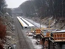 Final design of the station, including analyzing 26 nearby homes for noise abatement, was expected to be completed in the middle of 2012. However, local elected officials demanded an independent design review of the project, further delaying the project to at least 2015.[9] The MBTA had planned to advertise the $10 million construction contract in December 2012, but did not do so.[12] In July 2013, the MBTA announced that construction would begin within several months, but again this was a false start.[13] A public meeting held in April 2014 showed mixed local opinions about the stations, with some nearby residents feeling that the stop was imposed on the neighborhood by the MBTA without sufficient public input.[14] At that meeting, the MBTA presented a plan under which construction would begin in May 2015 for a December 2016 opening.[15] A later meeting in September 2014 adjusted the schedule, with construction beginning in September 2015 for a June 2017 opening.[2]