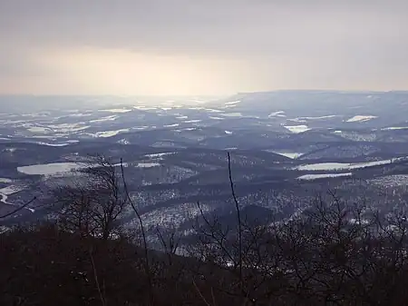 The mountain is the site of 5,874-acre (23.77 km2) Blue Knob State Park and contains approximately 18 miles (29 km) of hiking trails and numerous overlooks. An alpine ski area is located on the mountain's north slopes.[4] The towns of Pavia and Claysburg lie at the foot of the mountain, and Johnstown, Altoona, and Bedford are located within 25 miles (40 km).