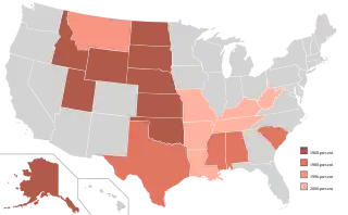 The states which Republicans have won in the last eleven elections (from 1980 to 2020) are Texas (40), Alabama (9), South Carolina (9), Oklahoma (7), Mississippi (6), Utah (6), Kansas (6), Nebraska (4) (but not Nebraska's 2nd congressional district), Idaho (4), South Dakota (3), North Dakota (3), Alaska (3), and Wyoming (3), giving a total of 103 votes. Additionally, Tennessee (11), Missouri (10), Kentucky (8), Louisiana (8), Arkansas (6), West Virginia (4), and Montana (4) have been won by Republicans in the last six elections (from 2000 to 2020), making more recent additions to the red wall/sea, bringing the total electoral votes up to 154. Other states with a 10-out-of-11 (from 1980 to 2020) Republican record include North Carolina (16) and Indiana (11), whose 27 electoral votes added to the 154 of the preceding twenty red sea states make for a total of 181 electoral votes, although North Carolina is usually a swing state that leans slightly towards Republicans, enough to prevent Democrats from winning it except in blowout years for them.