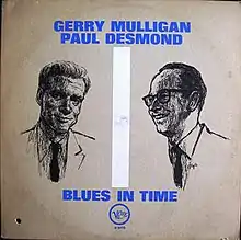 Gerry Mulligan - Paul Desmond Quartet (later retitled Blues in Time) is a jazz album by Paul Desmond and Gerry Mulligan released in 1957 on the Verve label.[5][6] The idea for this album was born in 1954, then postponed till summer of 1957 when Desmond suggested to record some pieces together. Producer Norman Granz managed to set up the recording date for the first session in August.[7] Blues in Time was also reissued on Verve V 8478 with a different cover (see below). The album is the first of two albums Mulligan and Desmond recorded in a pianoless quartet setting. The second, recorded in 1962, was Two of a Mind.