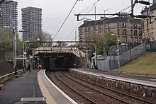 Demolition of the towers was originally scheduled to take place prior to the 2014 Commonwealth Games, but the complexity of the task pushed the date back to early 2015. Owing to the buildings' design, and their close proximity to the busy North Clyde Line railway which runs immediately next to the site, a conventional "blowdown" with explosives was deemed impractical. The buildings instead would be literally disassembled floor by floor using the "top down" method.[5] The deconstruction process began on in January 2015, starting with the Bluevale tower. The neighbouring Whitevale tower was deconstructed in a similar fashion in 2016.[6]