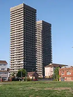 The Bluevale and Whitevale Towers were twin tower block flats situated in the Camlachie district within the East End of Glasgow, Scotland. Officially named 109 Bluevale Street and 51 Whitevale Street, and often nicknamed the Gallowgate Twins or the Camlachie Twin Towers, the two towers were for a time the tallest buildings in Scotland.[1][2]