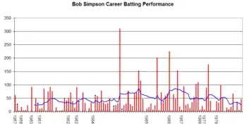Despite his heavy scoring at first-class level, Simpson was yet to hit a Test century when he arrived with his team in England in 1964.[6][7] After making a slow start to the tour and not passing 31 in his first four innings, Simpson struck form after the first week of May. He passed 50 in seven consecutive innings, making 125 against Somerset, 138 and 55 against Surrey, 57 against Glamorgan, 95 against Cambridge University, and 105 and 52—both not out—in a nine-wicket win over the MCC. He augmented this with 4/48 against Surrey.[9]
