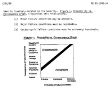 Aviation safety risk is defined in AC 25.1309-1, an FAA document describing acceptable means for showing compliance with the airworthiness requirements of § 25.1309 of the Federal Aviation Regulations (FAR). A catastrophic failure must have an extremely improbable rate, defined as one in a billion flight hours, also stated as less than 10−9 per flight hour.[74]