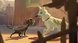 In New York, Bolt resumes his search for Penny. Much to his dismay and confusion, he finds out the hard way that his "superpowers" are useless. He encounters Mittens, a cynical feral cat who bullies pigeons out of their food. Believing that Mittens is an “agent” of Calico, Bolt ties her to him with a leash and forces her to guide him back to Penny. Mittens is convinced her captor is a lunatic, but the two start their journey westward by truck. Meanwhile, in Hollywood, a less-experienced Bolt look-alike is brought in so filming can resume. Penny is genuinely distraught over Bolt’s disappearance but reluctantly agrees to halt the search so production can continue.