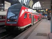 2. Generation Doppelstockwagen in DB Verkehrsrot colours on a Rostock S-Bahn service (July 2013)
