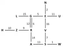 Once a suitable crib had been decided upon, the cryptanalyst would produce a menu for wiring up the bombe to test the crib against the ciphertext. The following is a simplified explanation of the process of constructing a menu. Suppose that the crib is ATTACKATDAWN to be tested against a certain stretch of ciphertext, say, WSNPNLKLSTCS. The letters of the crib and the ciphertext were compared to establish pairings between the ciphertext and the crib plaintext. These were then graphed as in the diagram. It should be borne in mind that the relationships are reciprocal so that A in the plaintext associated with W in the ciphertext is the same as W in the plaintext associated with A in the ciphertext. At position 1 of the plaintext-ciphertext comparison, the letter A is associated with W, but A is also associated with P at position 4, K at position 7 and T at position 10. Building up these relationships into such a diagram provided the menu from which the bombe connections and drum start positions would be set up.