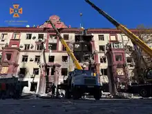 - ↑ "Російські терористи знову вдарили по Запоріжжю: зруйновано під'їзд багатоповерхівки у центрі міста (фото, відео)". 1news.zp.ua. 10 October 2022.