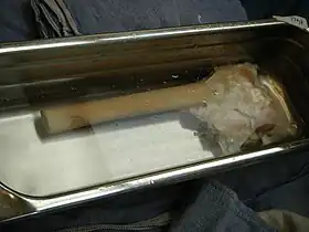 Allograft bone, like autogenous bone, is derived from humans; the difference is that allograft is harvested from an individual other than the one receiving the graft. Allograft bone can be taken from cadavers that have donated their bone so that it can be used for living people who are in need of it; it is typically sourced from a bone bank. Bone banks also supply allograft bone sourced from living human bone donors (usually hospital inpatients) who are undergoing elective total hip arthroplasty (total hip replacement surgery). During total hip replacement, the orthopaedic surgeon removes the patient's femoral head, as a necessary part of the process of inserting the artificial hip prosthesis. The femoral head is a roughly spherical area of bone, located at the proximal end of the femur, with a diameter of 45 mm to 56 mm in adult humans. The patient's femoral head is most frequently discarded to hospital waste at the end of the surgical procedure. However, if a patient satisfies a number of stringent regulatory, medical and social history criteria, and provides informed consent, their femoral head may be deposited in the hospital's bone bank.