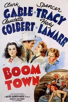 Boom Town is a 1940 American Western film starring Clark Gable, Spencer Tracy, Claudette Colbert, and Hedy Lamarr, and directed by Jack Conway. The supporting cast features Frank Morgan, Lionel Atwill, and Chill Wills. A story written by James Edward Grant in Cosmopolitan magazine entitled "A Lady Comes to Burkburnett" provided the inspiration for the film.[3] The film was produced and released by Metro-Goldwyn-Mayer.