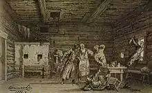 The Revised Version of 1872 received its world premiere on 27 January 1874 at the Mariinsky Theatre. The Cell Scene was omitted. The Novodevichiy and Coronation scenes were combined into one continuous scene: 'The Call of Boris to the Tsardom'. Matvey Shishkov's design for the last scene of Pushkin's drama, 'The House of Boris' (see illustration, right), was substituted for this hybrid of the Novodevichiy and Coronation scenes.[38] The scenes were grouped in five acts as follows:[39]