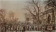 The triumphant 1873 performance of three scenes paved the way for the first performance of the opera, which was accepted for production on 22 October 1873.[27] The premiere took place on 27 January 1874, as a benefit for prima donna Yuliya Platonova.[14] The performance was a great success with the public. The Mariinsky Theatre was sold out; Mussorgsky had to take some 20 curtain calls; students sang choruses from the opera in the street. This time, however, the critical reaction was exceedingly hostile[28] [see Critical Reception in this article for details].