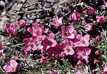 Boronia pulchella, commonly known as the pink boronia,[2] is a plant in the citrus family Rutaceae, and is endemic to a small area in the south-west of Western Australia. It is a slender shrub with rod-like stems, pinnate leaves and deep pink, four-petalled flowers.