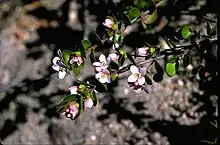 Boronia rhomboidea, commonly known as the broad-leaved boronia or rhomboid boronia,[2] is a plant in the citrus family Rutaceae and has a disjunct distribution in New South Wales and Tasmania in Australia. It is an erect, woody shrub with many branches, simple, broadly egg-shaped to almost circular leaves and groups of up to three white to pale pink, four-petalled flowers on the ends of the branches or in the axils of the upper leaves.