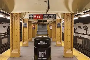 Work on the project had begun by 1983[97] but had fallen behind schedule two years later.[101] One of the issues was that the MTA had wanted to save the original tiles in the Eastern Parkway Line station, a designated New York City landmark, but the agency could not get the tiles to stick to the wall.[102] New tiles had to be imported from Czechoslovakia, and some tiles were stolen before they could be installed.[103] Some newly-renovated parts of the station were already deteriorating by 1987, such as tiled floors that had come loose.[103][104] Other parts of the renovation had been conducted haphazardly, such as the uneven installation of gray wall tiles,[104][105] as well as a ceiling that had been repainted above the platforms but not the tracks.[104] At that point, it had taken nearly as long to renovate the station as to construct the original line.[106] The New York City Transit Authority eventually filed a lawsuit to compel the renovation contractor to complete the project.[107] The rest of the complex was also slated to be renovated, but the improvements were temporarily delayed in 1987 because of the poor quality of the Eastern Parkway Line station's renovation.[108] MTA officials diverted funding for the other platforms' renovations in December 1989 to cover a budget shortfall.[109]
