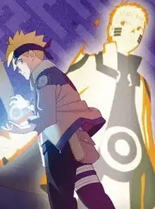 | Naruto, Sasuke and the four other Kage fight against Momoshiki Otsutsuki. Although most of them are defeated, Naruto and Sasuke manage to team up and defeat Momoshiki. Before Momoshiki's death, he is accidentally helped by Katasuke and his Scientific Ninja Tool to recover his chakra. As Naruto is weakened, he passes his energy to Boruto to create an enhanced Rasengan, putting an end to Momoshiki's life. While dying, Momoshiki talks to Boruto and gives him a mysterious seal. | |||||