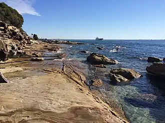 The coast is characterised by rocky sandstone cliffs demonstrating a fine example of the stratification of Hawkesbury sandstone. The cliff formations are punctuated by large gorges, the result of eroded basalt dykes which formed in the sedimentary rock in the early Tertiary period.[2][26]