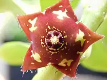 Boucerosia frerei is a fleshy perennial succulent with 50 cm (20 in) long branches that have elliptic-oblong leaves that are 7 cm (2.8 in) long. The leaves grow during the monsoon season—in a habit that is unusual compared to its close relatives, it drops the leaves during dry seasons to conserve moisture. The crimson to cherry-red flowers are star shaped with yellow markings and have a 2 to 3 cm (0.79 to 1.18 in) corolla, with patterns of markings that vary from one population to another. Flowers smell of rotten meat and are lined with fine cilia. The deciduous leaves of this plant use regular C3 photosynthesis, while the stem utilizes C4 like most succulents. During dry seasons or dry spells leaves will fall off and the plant will rely on its stem for photosynthesis. The stem may take on a sliver velamin like texture[2] It blooms from August to September.[3]