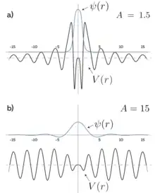 The expression for the potential is cumbersome, but the graphs show that for the potential tends to -1. Furthermore, it turns out that for any one can choose such an A that the potential is between and . We can see that the potential oscillates with period and the wave function oscillates with period . It turns out that all reflected waves from the "humps" of such a potential are in phase, and the function is localized in the center, being reflected from the potential by a mechanism similar to the reflection from a Bragg mirror.
