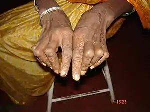 Boutonniere deformity is a deformed position of the fingers or toes, in which the joint nearest the knuckle (the proximal interphalangeal joint, or PIP) is permanently bent toward the palm while the farthest joint (the distal interphalangeal joint, or DIP) is bent back away (PIP flexion with DIP hyperextension). Causes include injury,[1] inflammatory conditions like rheumatoid arthritis, and genetic conditions like Ehlers-Danlos syndrome.[2]