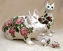 Following the closure of The Bovey Pottery Company, a creditor intervened to ensure the pottery was incorporated under the directorship of Bristol-based pottery, T.B Johnson. The company's fortunes declined due to several challenges including the depression, loss of workers to the war effort and union strikes, and closed in 1957.[13] The pottery was best known for Commemorative cups, Dartmoor Ware and a collection of porcelain figurines called 'Our Gang' including representations of Winston Churchill, Theodore Roosevelt and Joseph Stalin.[14]