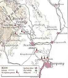 A map showing the main sites of pottery making in the area local to "Bovey Basin".