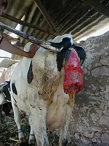 Similar condition that is also connected with a prolapse of cow's reproductive organs, is so-called bovine uterine prolapse, when a uterus gets prolapsed.[4] This usually occurs some hours after calving.[11] The latter condition is much less common in cattle and can be life-threatening in extreme cases.[1][3] The condition requires immediate treatment,[4] which is either reducing the prolapse either amputating the exposed uterus and in severe cases euthanizing the animal,[5] as an untreated cow can die from shock (intensive bleeding) or becomes infertile.[4]