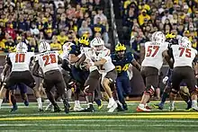 The Falcons began Nehlen's fifth season as head coach against Purdue on September 16, 1972.[32] The game was tied in the fourth quarter when the Falcons moved into field goal range and Don Taylor kicked the ball through the uprights to give the Falcons a 17–14 upset win against a top 20 ranked opponent.[7][33] In the 1973 season, BG again picked up a big opening win, at Syracuse 41–14.[32][33] The Falcons' rushing game greatly improved under Nehlen. The team was led by Paul Miles, who ran for more than 1,000 yards in three consecutive seasons from 1971 to 1973.[7] Miles teammate, Dave Preston earned a position as the career leader in rushing with 3,423 yards during his time with the Falcons. In 1975, Dan Saleet rushed for a team leading 1,114 yards.[7] Nehlen led the Falcons added two more upsets in the Nehlen era with a 23–21 win over BYU and a 22–7 win against Syracuse in 1975 and 1976 respectively. The major wins gave Nehlen the unofficial title of the “Master of the Upset” from many BGSU fans.[33] Nehlen left Bowling Green after the 1976 season and guided the Falcons to a 53–35–4 record in nine seasons as head coach.[33] He went on to coach at West Virginia and coached 21 seasons for the Mountaineers and became the 17th coach in NCAA Division I-A history to record 200 victories with a 202–128–8 overall record.[34]
