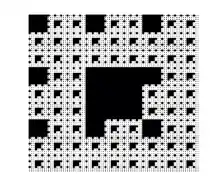 Box fractal also refers to various iterated fractals created by a square or rectangular grid with various boxes removed or absent and, at each iteration, those present and/or those absent have the previous image scaled down and drawn within them. The Sierpinski triangle may be approximated by a 2 × 2 box fractal with one corner removed. The Sierpinski carpet is a 3 × 3 box fractal with the middle square removed.