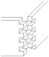 A box joint is a woodworking joint made by cutting a set of complementary, interlocking profiles in two pieces of wood, which are then joined (usually) at right angles, usually glued. The glued box joint has a high glued surface area resulting in a strong bond, on a similar principle to a finger joint. Box joints are used for corners of boxes or box-like constructions, hence the name. The joint does not have the same interlocking properties as a dovetail joint, but is much simpler to make, and can be mass-produced fairly easily.