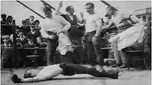 Boxing Match; or, Glove Contest is an 1896 British short black-and-white silent documentary film, produced and directed by Birt Acres for exhibition on Robert W. Paul's peep show Kinetoscopes, featuring a staged boxing match between Sergeant-Instructor Barrett and Sergeant Pope with a round, an interval and a knockout. The film was considered lost until footage from an 1896 Fairground Programme, originally shown in a portable booth at Hull Fair by Midlands photographer George Williams, donated to the National Fairground Archive was identified as being from this film.[1]