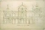 The palace was built between 1639 and 1642 by Lorenzo de Sent for Crown Grand Chancellor Jerzy Ossoliński in Mannerist style. It was built on the plan of an elongated rectangle with two hexagonal towers at garden side of the building.[1] The palace was adorned with sculptures – an allegory of Poland above the main portal, four figures of kings of Poland in the niches and a statue of Minerva crowning the roof. A possible inspiration for the palace's upper pavilion and its characteristic roof was Bonifaz Wohlmut's reconstruction of Belvedere in Prague, 1557–1563.