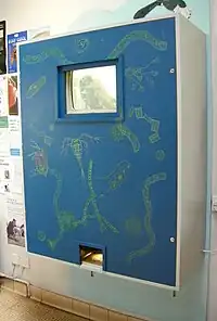 In the Entrance room next to Reception is a six-foot-high, interactive video microscope. You place a dish of natural objects (for example houseflies) on the lighted tray at the bottom, and move it around until it shows in the video screen at the top. The tray is at child-height to enable youngsters to take part. On the screen a housefly looks bigger than your hand, so that its details might be observed easily.[7]