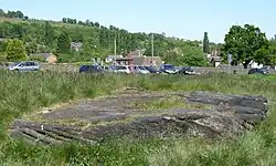 This is one of the nationally important Rombalds Moor cup and ring rocks. They were engraved in the neolithic era, and the larger engraved rocks have been left on the moor as it is thought that their meaning may be associated with the landscape. This more portable rock is in the museum for safety: the plough-marks on the rock indicate one of the reasons for this. The Heygate stone is one of the clearest examples of this type of petroglyph. A cast of the engraving reveals that the two larger ring-marks are superimposed on the others.[18] The stone was found in Near Hey Gate Field near Baildon by a local landowner on 25 September 2001, and it is believed that it was originally a rock with a larger area of 5000-year-old petroglyphs that had been quarried nearby in recent history, then dressed on two sides for wall-building. It is at the landowner's wish that the stone is preserved at the museum, as near as possible to its original site, because it cannot now be returned to the position where it lay in the neolithic era.[19]