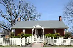 The Braithwaite House is a historic house at Bella Vista Drive and Braithwaite Street in Bentonville, Arkansas. Built c.1855, this single-story brick house may be the oldest house in Benton County, and is the only one of its type in the city. Its form is similar to a saltbox with a side gable roof that has a short front slope and an extended rear slope. An open porch with a shed roof extends across the front. The house was by James Haney, an Irish brick mason, for the Braithwaites, who were major local landowners.[2]