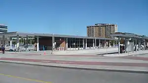 Bramalea Terminal[2] is a Brampton Transit bus station serving the community of Bramalea in Brampton, Ontario, Canada. It is located at the south west corner of Peel Centre Drive and Central Park Drive on the north side of the Brampton Civic Centre. The customer service centre building is situated in the northerly of two island platform areas, which are accessed by pedestrian cross walks. Within the building are service counters, washrooms, snack vending machines and a heated waiting area with screens displaying current bus route information.